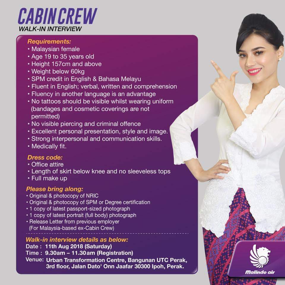 Malindo Airways Flight Stewardess Recruitment – Aug 2018 by admin To get the latest update on cabin crew / flight attendant jobs opportunity, please LIKE our Essential facebook pages.