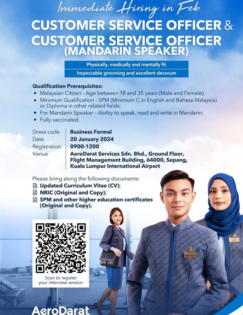 AeroDarat Customer Service Officer Recruitment- Jan 2024 (KUL)