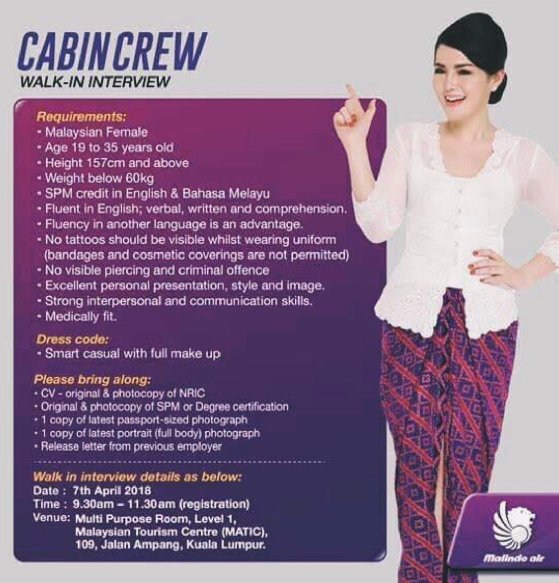 If you are interested, please send your cv/resume to hr@malindoair.com with your email title as ” Application for the position of cabin crew via essentialmalaysia.com ”